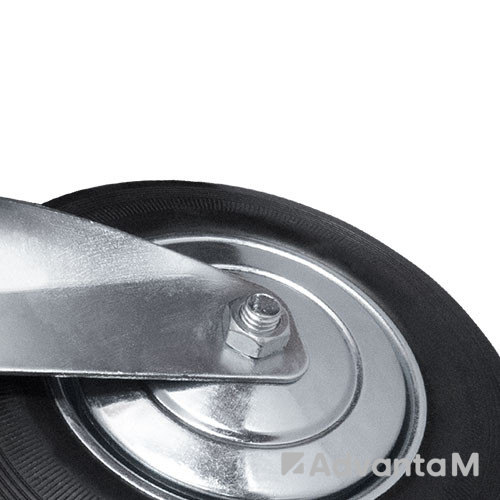 Плавное движение по любому типу поверхности обеспечивает шинка из износостойкой чёрной резины. В оси надёжный роликовый подшипник, в поворотном узле – двухрядный шарикоподшипник с пластиковым пыльником. Размер платформы 102x84 мм, расстояние между центрами отверстий 80x60 мм. Общая высота колесной опоры 150 мм.