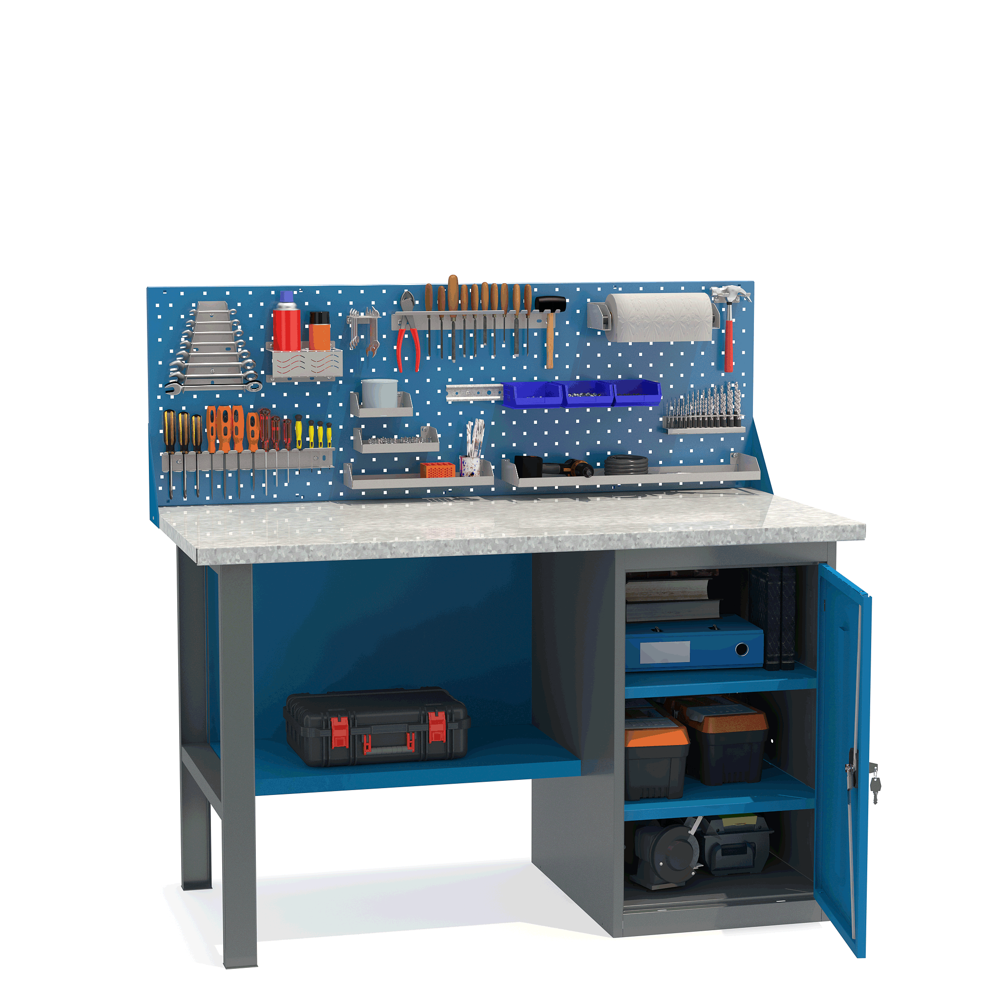 - Верстак имеет надежную модульную конструкцию с усиленной столешницей (плита МДФ 25мм, покрытая листом оцинкованного металла).