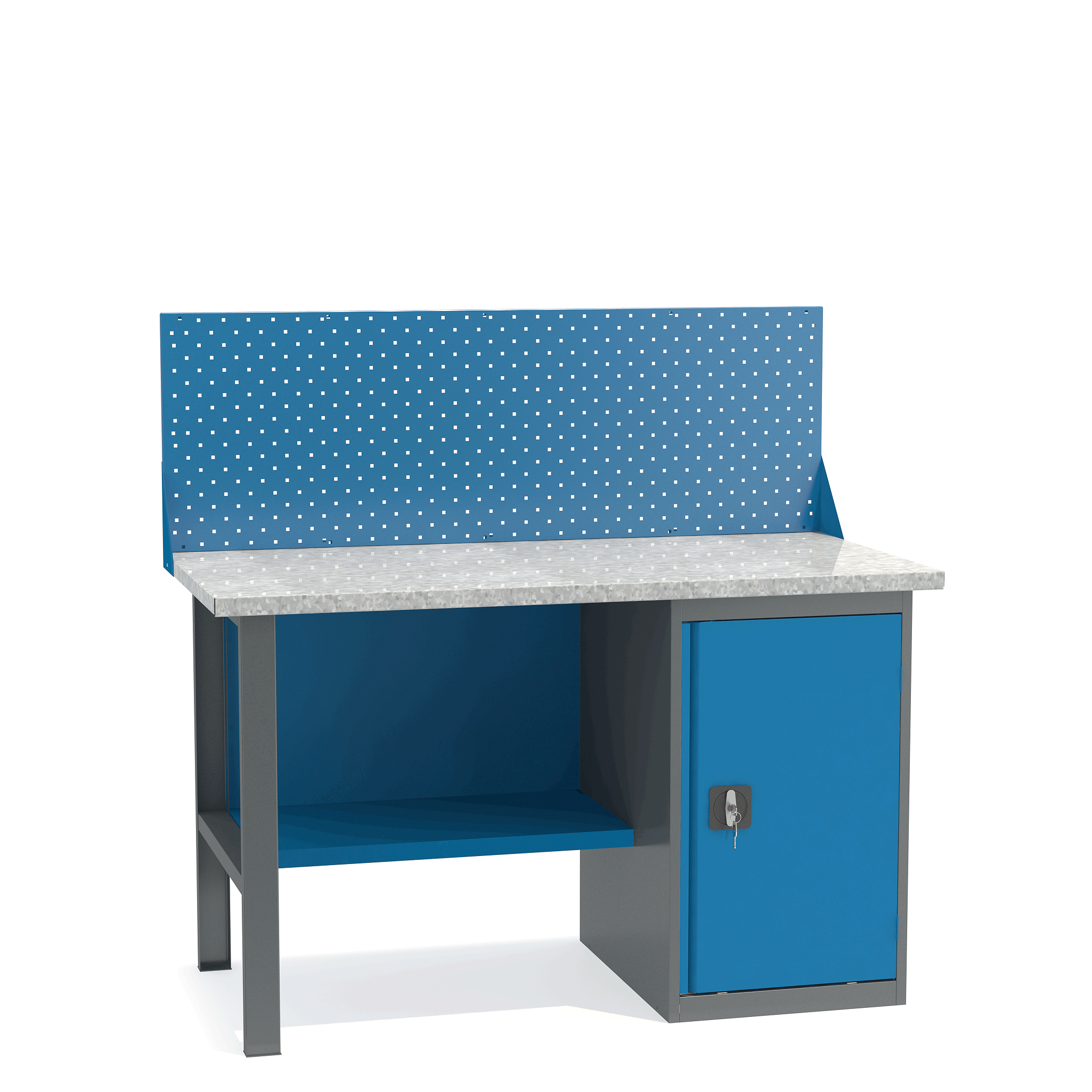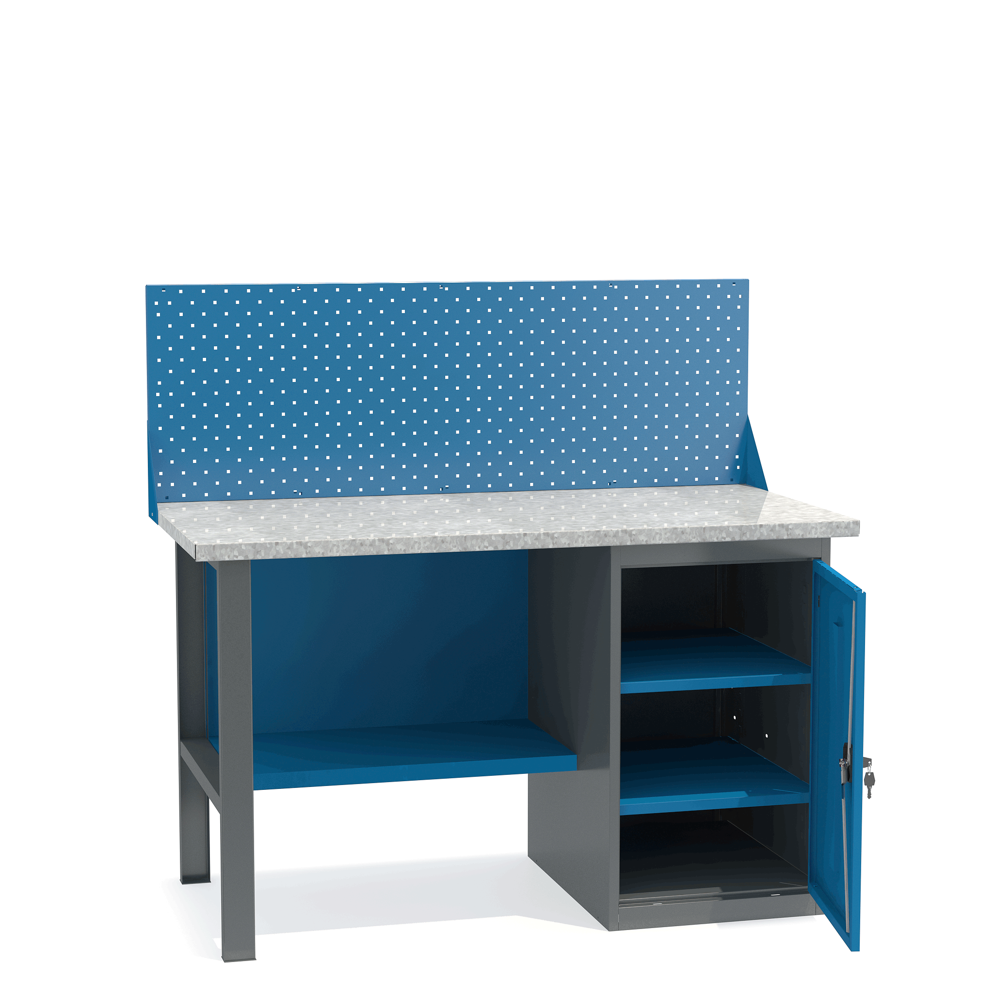 - Верстак укомплектован тумбой с полками.